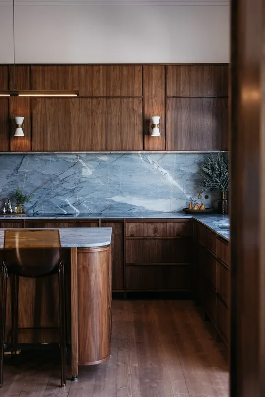 Walnut timber joinery and wall panelling exude elegance and timeless design. Whilst simplicity and visual lines are a gentle nod to the mid-century era and Scandinavian design.